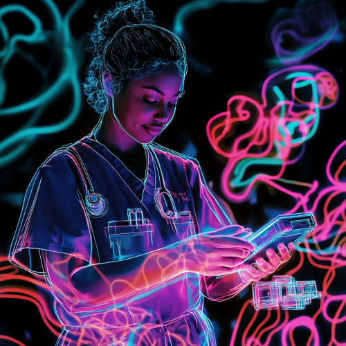 a bright neon sterile processing technician wearing scrubs, holding a handheld barcode scanner, she is scanning small plastic packages of medical devices, neon water drops, outline drawing, glowing colour, black background with neon nebula