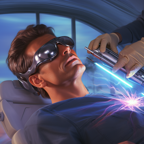 an ultra realistic image of a 40 year old attractive male receiving a laser hair treatment at a doctor's office