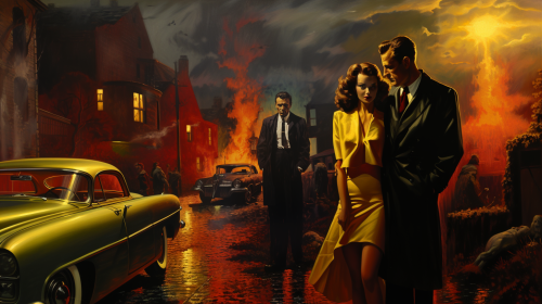 an image of a color painting in the 1940's pulp-noir style, --v 5.2 --ar 16:9 --zoom 2