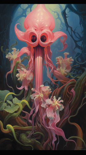 Horror movie in the style of 80's horror movie footage, film poster layout, realistic,giantcarnivorous plant monster, blue pink green COLORS, oranges glow, strange light, glow in the dark, oilpainting, adding a touch of realism and depth, By loish, by alex ross, by frank frazetta --ar 9:16 --s 50 --v 5.2