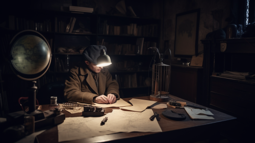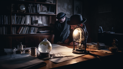 clear focused colour photo looking to investigator with black kettle hat sitting by the table in dark investigator room of Latvian security forces in year 1930, detailed, chaos, wooden table, books, photos on wall, lamp, --ar 16:9 --upbeta --v 5.0