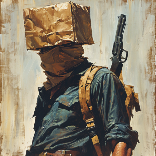 1980's pulp book cover art of a man wearing a paper bag over his face, paper bag covering his entire head, wearing a black shirt, holding a gun, wearing a backpack, robbing a bank --s 250 --v 6.0