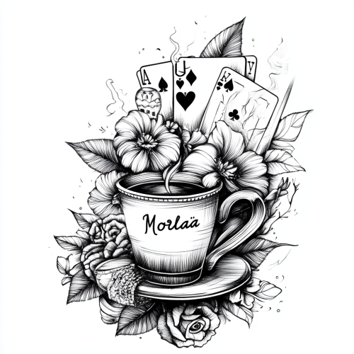 A tattoo design featuring an illustration style with coffee or tea cup and the name Norma and the a playing card symbol in black also there is a knit elements adding elegance. It's a detailed and visually appealing piece that captures both artistic expression and symbolic meaning. The style is in the style of high resolution tattoo design line art