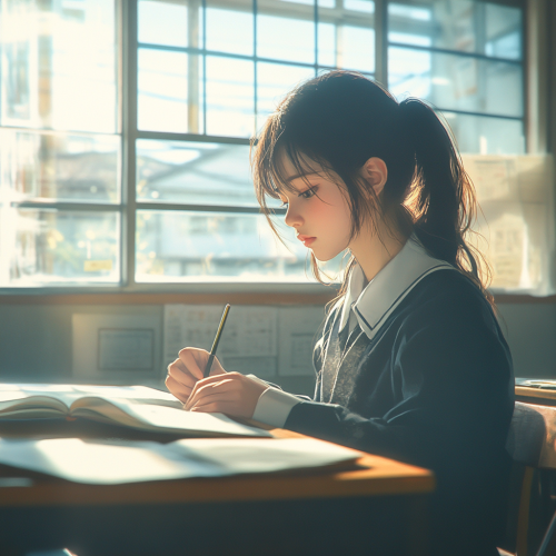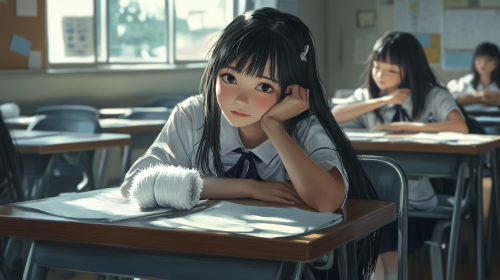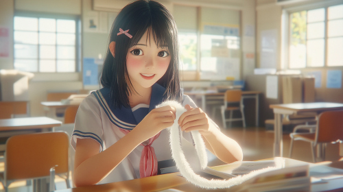 In a realistic style, a Japanese high school girl is studying at her desk in a classroom. She has a white, fluffy band-like object wrapped around her hand, which rests on the desk. She is looking at it with a relieved and gentle smile, surrounded by typical classroom elements like desks and chair --ar 16:9