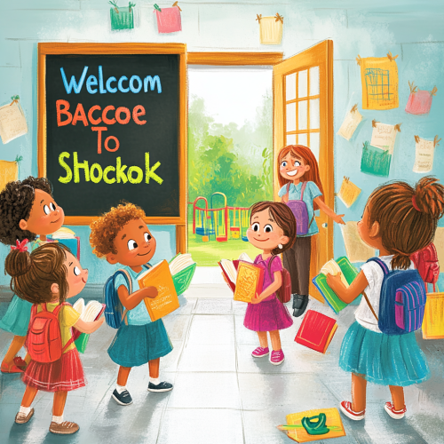 Create a vibrant and welcoming image that captures the excitement of the first day of school. The scene should include a cheerful classroom with colorful decorations, a chalkboard, and group of happy children holding books and backpacks. Outside the classroom window, the sun is shining, and a playground can be seen. The atmosphere should be full of energy and anticipation for a new year of learning.