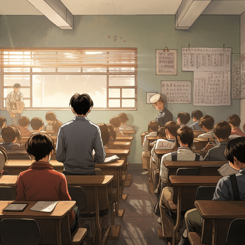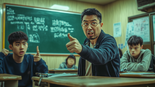 In a Taiwanese high school classroom, a middle-aged male teacher angrily scolds a student in front of the blackboard. The teacher has an angry expression and is pointing at the student, who is looking down with a sad and guilty expression. The classroom is filled with typical high school furniture, and other students are sitting silently at their desks, looking anxious and scared. The classroom environment includes Taiwanese high school details such as posters on the walls, fluorescent lights, and a traditional green chalkboard, with high detail and historical accuracy ,photograph --ar 16:9