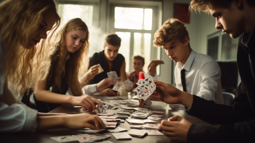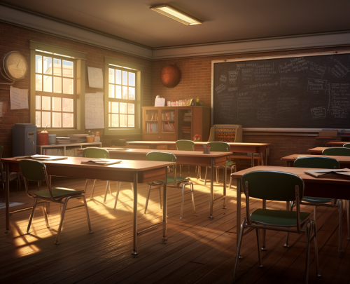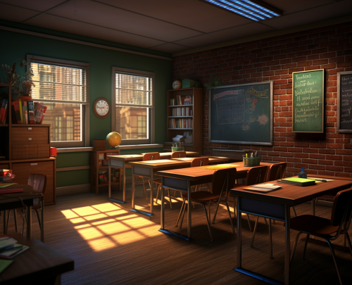 classroom in an american high school with a black chalk board and desks, luminous 3d objects, lights and darks, wood, brick, posters, books, shelves, windows xp, suburban vistas, 3d animation, digital art, detailled rendering --ar 16:13