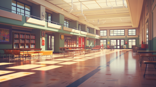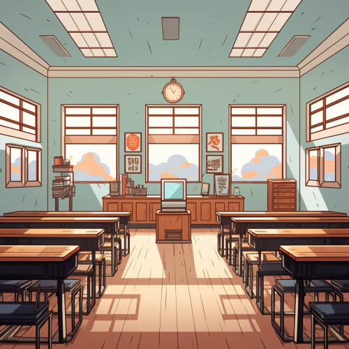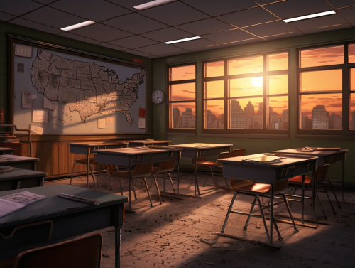 classroom in an american high school with a chalk board and desks, luminous 3d objects, lights and darks, wood, brick, posters, books, shelves, windows xp, suburban vistas, 3d animation, digital art, detailled rendering --ar 16:13