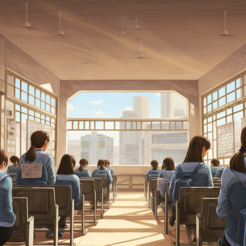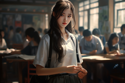 a lovely chinese senior high school girl, pure, with long pants and t-shirts, in the classroom, --ar 3:2