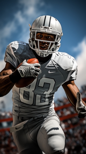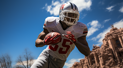 American high school football player. Extreme blue skies. Rear view of football player. Picture taken from behind football player. Action shot on the field. Extreme low angle shot. Black and white with vibrant color splash. Full body shot. Jersey number “8”. Quarterback scoring game winning touchdown in final seconds of the game. In the style of a sports illustrated cover photo. Geometric. Dramatic. Award winning. Packed stadium. Extreme blue skies. Exciting. Photorealistic. High - end. Stylish. Shot with a Pentax. K - 3 III Monochrome. --ar 16:9 --q 0.5 --s 750