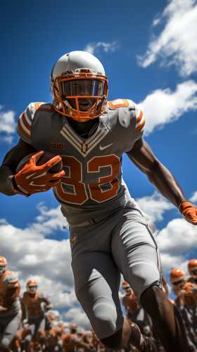 college football. Action shot on the field. Black and white with vibrant color splash. Full body shot. Jersey number “8”. Quarterback scoring game winning touchdown in final seconds of the game. In the style of a sports illustrated cover photo. Modern art. Dramatic. Award winning. Packed stadium. Extreme blue skies. Exciting. Photorealistic. Extreme low angle view. Black and white. High - end. Stylish. Important. Mysterious. Shot with a Pentax. K - 3 III Monochrome. --ar 9:16 --q 0.5 --s 750