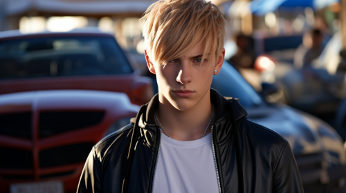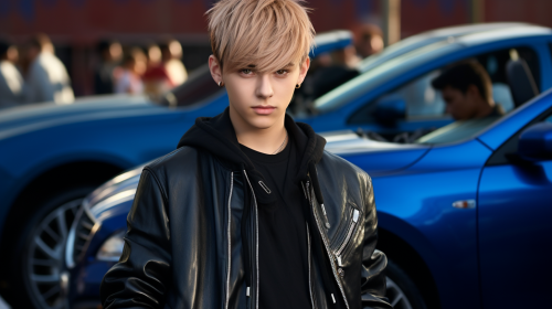 a photorealistic medium-body shot of a blond short-haired male junior high school student standing in front of an expensive black sports car. He wears a black leather racer jacket with sponsor patches on it and ripped blue jeans. He has a side-swept undercut and earlobe piercing and some sparsely spread stubble. Dramatic lighting. Photorealistic, high quality, hyper-realistic, up beta, 8k uhd, --no painting --ar 16:9 --s 150 --v 5.2