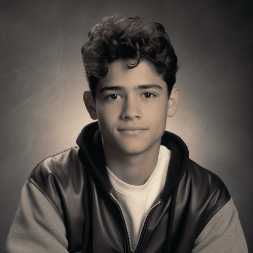 grayscale class yearbook photo for Elias Maldonado, a 9th grade boy in 1988, artistic
