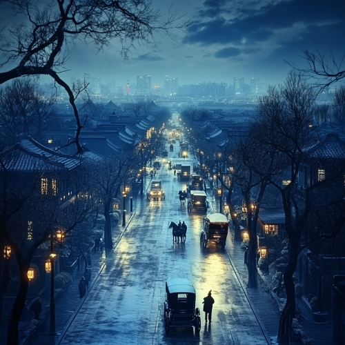 What Beijing looks like past, fascinating, 1900s, imaginative, realistic, photographic of the city of Beijing, background Beijing city view, incredible, creative, Beijing DC 3d render, old Washington houses, old cars, old people, horse carriage, trees, night, dark blue,