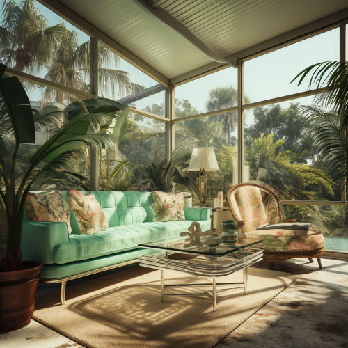Floridian sunroom, mid century modern, patina green furniture, glass, carpet, hyper realistic, architectural, vintage