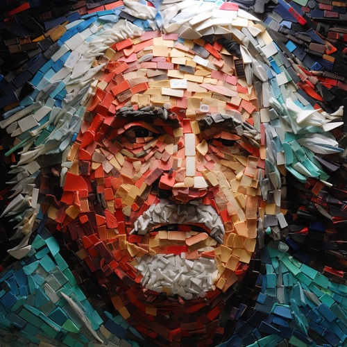 a mosaic-like artwork of "jose mujica" made from ocean plastic sheet trash in the "cecilia mattos" style. --ar 1:1