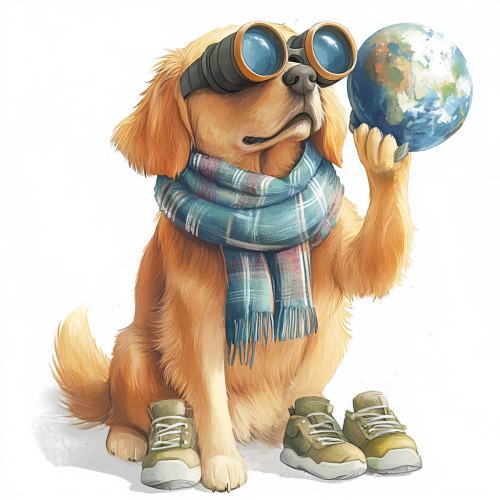 A curious Golden Retriever Dog with hands and legs ,wearing a scarf and sports shoes illustration, soft light, pastel colors, children's book illustration , white background,using binoculars to see earth , 2d flat illustration