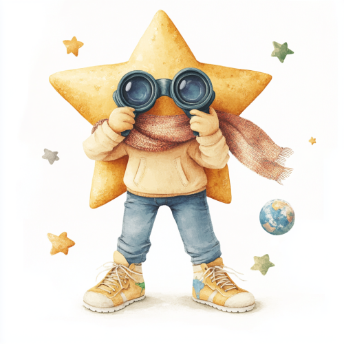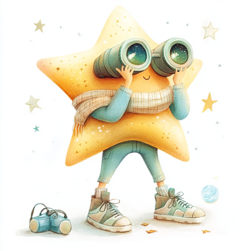 A curious star with hands and legs ,wearing a scarf and sports shoes illustration, soft light, pastel colors, children's book illustration , white background,using binoculars to see earth , 2d flat illustration