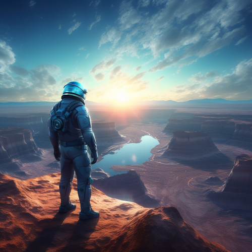 On the surface of an alien world, an astronaut stands alone, surrounded by a landscape of alien beauty. In the sky above, a breathtaking array of planets looms, each one distinct and awe-inspiring. The nearest planet is a vibrant blue, casting a soft light on the rugged terrain below. The astronaut's suit, a sleek design of white and silver, glows subtly in this alien light. Their posture is one of contemplation, as they take in the sight of these distant worlds, so different from their own. The terrain is a mix of sharp rocks and smooth plains, creating a stark contrast to the wonder in the sky. This image is a testament to the human spirit's drive to explore the unknown, a lone figure against the infinite canvas of space. Photo taken by Lorna Simpson with a Fujifilm GFX 100 and a 32-64mm lens, Award Winning Photography style, Natural lighting with a touch of artificial illumination, 8K, Ultra-HD, Super-Resolution. --v 5.0