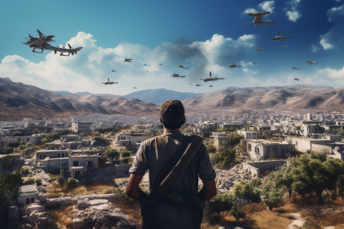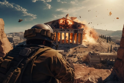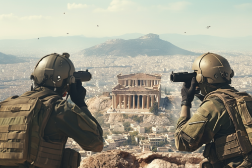 Athens by day, modern world war, bombers dropping bombs, photorealistic, high definition, photographic style, cinematic, soldier in the foreground wades through binoculars 8k, --ar 3:2