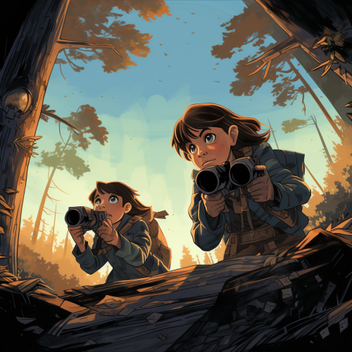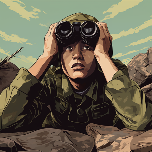 realistic close up front view of a camouflaged cyborg tank commander looking through futuristic binoculars whilst peering through the top of a futuristic armoured tank, background is a snowy forest