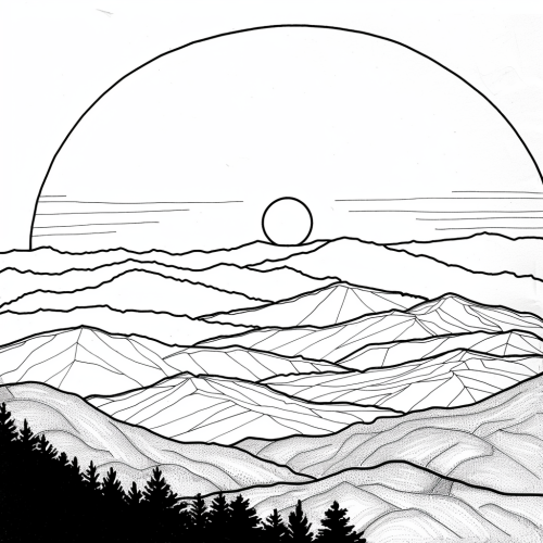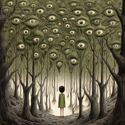 a forest with eyes staring, whimsical, and a female hiker standing in front of it, in the style of edward gorey