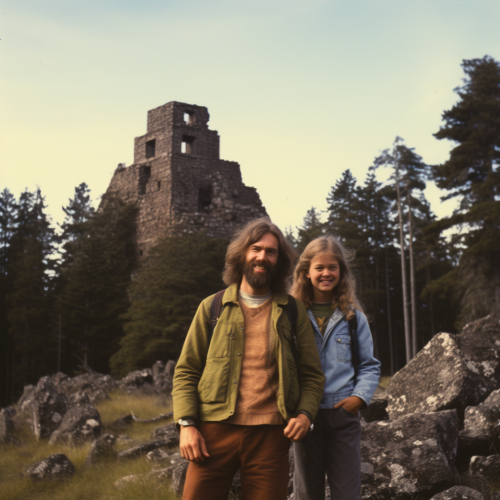 a 1980s family photograph of two hikers in the pacific northwest, smiling for the camera. In the background is a giant mysterious ruin