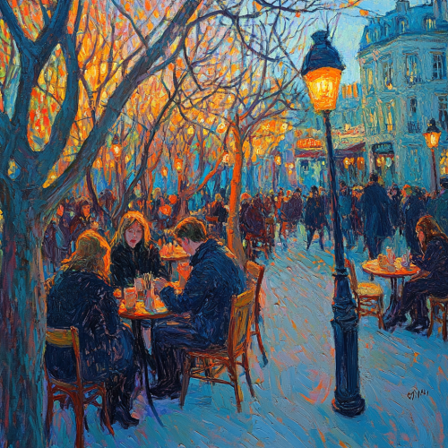 a painting of Erin Hanson in a scene in Paris, Lights on in the late afternoon, people at tables talking and drinking coffee, blue, terracotta and cane green. sparkling light, electric. dry trees with long dry branches. shadows of people on the ground are long. old lamp posts, in the style of holographic, rococo pastel colors, early computer art, transparent/translucent medium, decorative relief, steinheil quinon 55mm