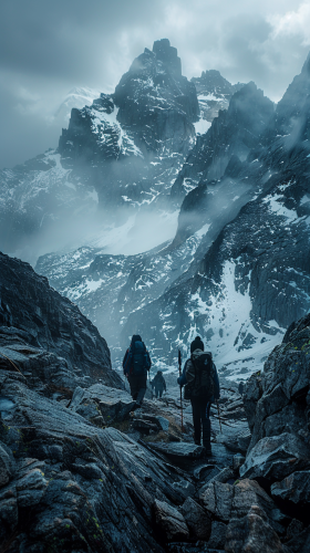 grim reaper hiking with two hikers, at longs peak colorado, dark cinematic, blue tones, stormy weather, dreamy, highly detailed 14mm shot on sony a7iv, 800 iso, sharp above tree line --ar 9:16 --v 6.0 --s 250