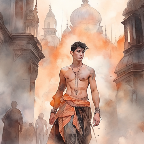 close-up, male filipino pinoy priest walking past a gothic hindu temple, holding a smoldering censer, inspired by kj apa tom daley adam rippon, colored inks style, style of luis royo, leonid afremov, mike zeck, edgard maxence, erin hanson --niji 5
