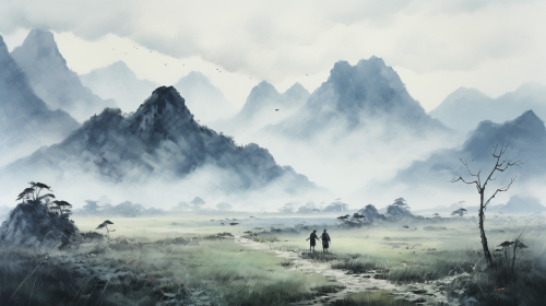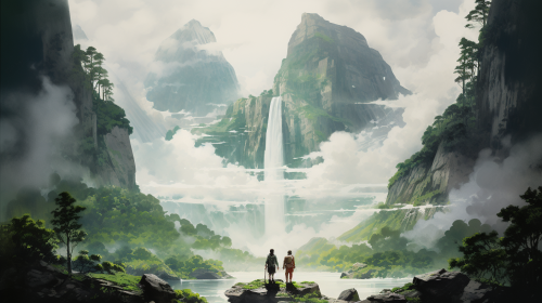 watercolor of a giant waterfall, scenic mountainscape two hikers in front --ar 16:9 --s 250