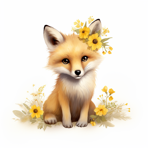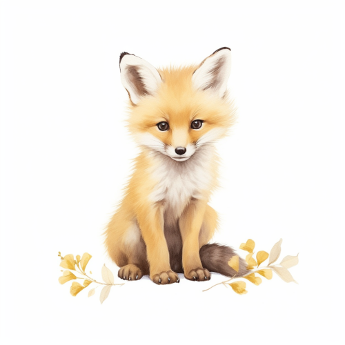 little fox on a white background art print enlarge version, looking forward, baby fox, in the style of birds & flowers, in style of Erin Stead, animated gifs, lighthearted, yellow and amber, elegantly formal, fairycore, depiction of animals