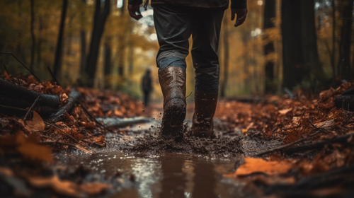 a person wearing hiking boots wades their way through thick mud toward the camera, surrounded by autumnal trees. Arri Alexa --ar 16:9