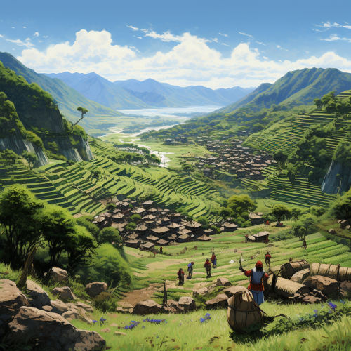 historical illustration of bronze age chinese farmers and villagers working in terraced field along hillside in mediterranean rocky mountains::5 digital artwork illustration, simple lines and details::3 authentic inca items and clothing and houses with thatch roofs::2 stone walls of stonework and terraces::1 colorful banners lining terraces::1 daytime, springtime, autumn, hills in background beautiful valley perspective::2
