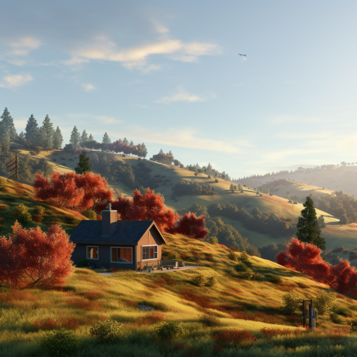 Realistic render image of a two-story house on a hillside with a hyper-modern architectural style with very clean volumes and uniform textures but inspired by an old Spanish villa --s 750 --v 6.0
