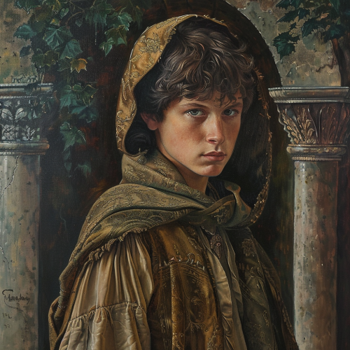 8th century oil painting portrait looking left of a human with the head of a blue and purple Indian ringneck parrot, featuring a bright red beak, with yellow around the eyes. The figure is wearing a traditional white curly wig, and a silk detailed cloth, detailed in the style of classical portraiture with rich, realistic textures and soft lighting. realistic, high resolution, dark color background