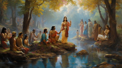 front facing picture of Lord Shri Ram and Sita walking in the palace where Sita is looking at Ram, surrounded by forts and trees with Laxman following them
