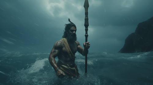 a cinematic of a hindu mythology still of lord parashuram throwing the large axe in the ocean extreme wide shot --ar 16:9