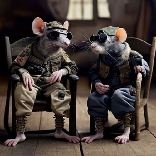 two anthropomorphic rats dressed as old war veterans from the meme wars of twenty twenty, the rats are sitting on rocking chairs at an old folks home circa 2100 the rats are sharing stories with one another laughing --v 4