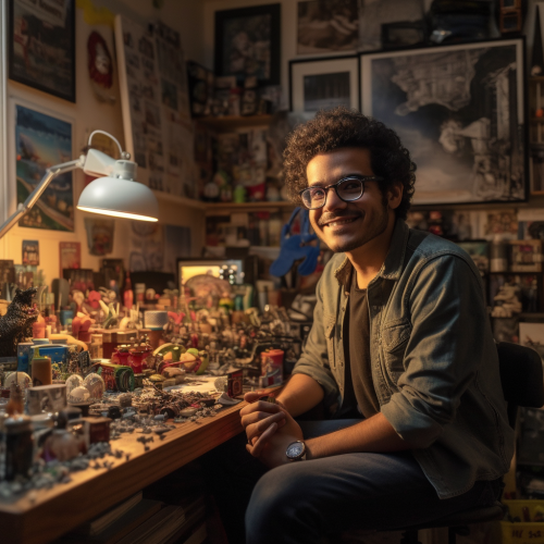 A 28-year-old Hispanic man in his small urban apartment, filled with creative energy. The room is cluttered but cozy, with a 3D printer on a desk and a variety of painted miniatures and figurines displayed on shelves. He has short, curly hair, glasses, and is wearing a casual graphic tee with paint stains. His face is focused and happy as he paints a detailed figurine, with bright LED desk lights illuminating his workspace. The walls are adorned with posters of science fiction and fantasy artwork. The scene captures a mix of artistic passion and technical hobby, with a warm and inviting atmosphere. --v 5.0 --s 750