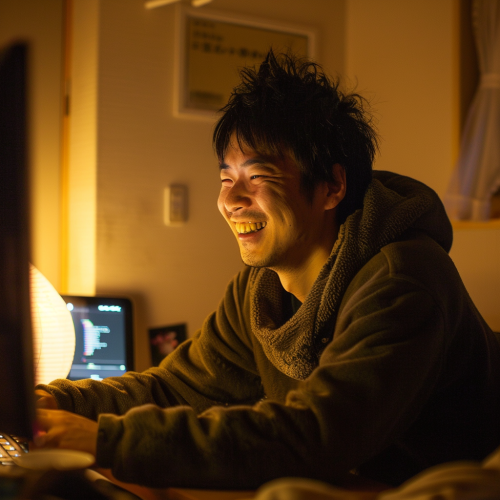 REAL man good looking Japanese man in his room at night, grinning, looking at his computer. --v 6.0 --style raw