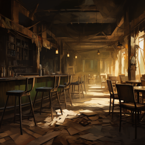 inside coffee shop, post apocalyptique scene, abandonned, bar, brush painting style. HD::
