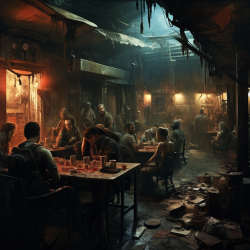 inside coffee shop, post apocalyptique scene, zombie, bar, brush painting style. HD::