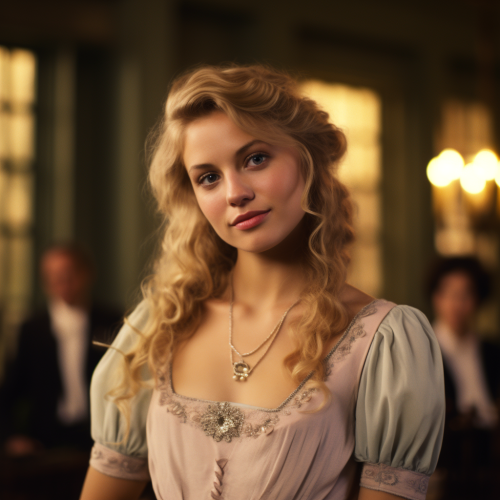a beautiful woman with long blonde hair who looks like Gracie Dzienny at a formal party in 1910 full color