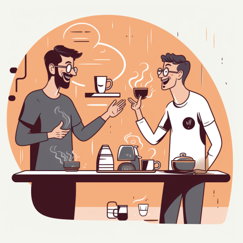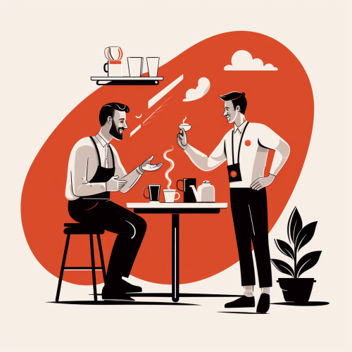 italian man drinking coffee at bat counter, talking with barista, gesticulating in exaggerating way, kissing his hand in Italian to mean it's good. Italian mood, lavazza brand, graphic design style, minimal, just lineart