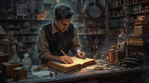 a man from the 1910s reading a lovecraftian style tome in his modest, wooden table in a room full of eldritch like scrolls, potions, and other dark weird stuff in the shelves. --ar 16:9 --v 6.0