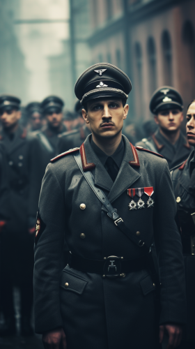a 30 year old man from the 1930s with long curly hair and a long bushy beard. he is very muscular. he is surrounded by 20 men in military uniforms. --ar 9:16 --v 6.0