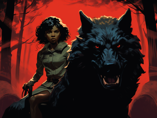 An angry teenage light skinned black girl in 1890s historically accurate clothes sits atop a ferocious giant black wolf in the style of Francesco Francavilla. Dense forrest, Moody lighting, gothic, horror, western, low angle, --ar 4:3