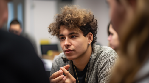 A lifelike image of a young history teacher standing at the front of a classroom, dressed casually, with a group of students attentively listening and interacting. The classroom has a modern design with large windows, wooden desks, and colorful educational materials. The lighting is natural, with warm tones highlighting the engagement between the teacher and students. Photographed with a Nikon D850, shallow depth of field, high contrast, vibrant colors --ar 16:9 --v 6.0