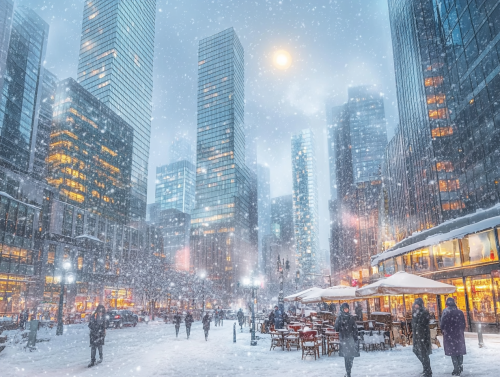Stock minimalist photography of a bustling modern metropolis during heavy snowfall. Tall skyscrapers are cloaked in snowflakes, while people walk bundled up in thick coats and scarves. no people in the streets. Streets are covered with snow and ice, and city lights reflect off the falling snow. Add cozy street cafés with snowy outdoor seating, and a few visitors sipping hot drinks. The soft glow of the moon peers through snowy clouds, in the style of tourism photography --ar 4:3 --no people --style raw --stylize 60 --v 6.1